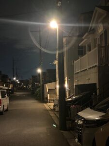 今回は電球色の器具を取付ました 点灯試験も夜間に行きましたが思ったより明るくて防犯効果抜群です